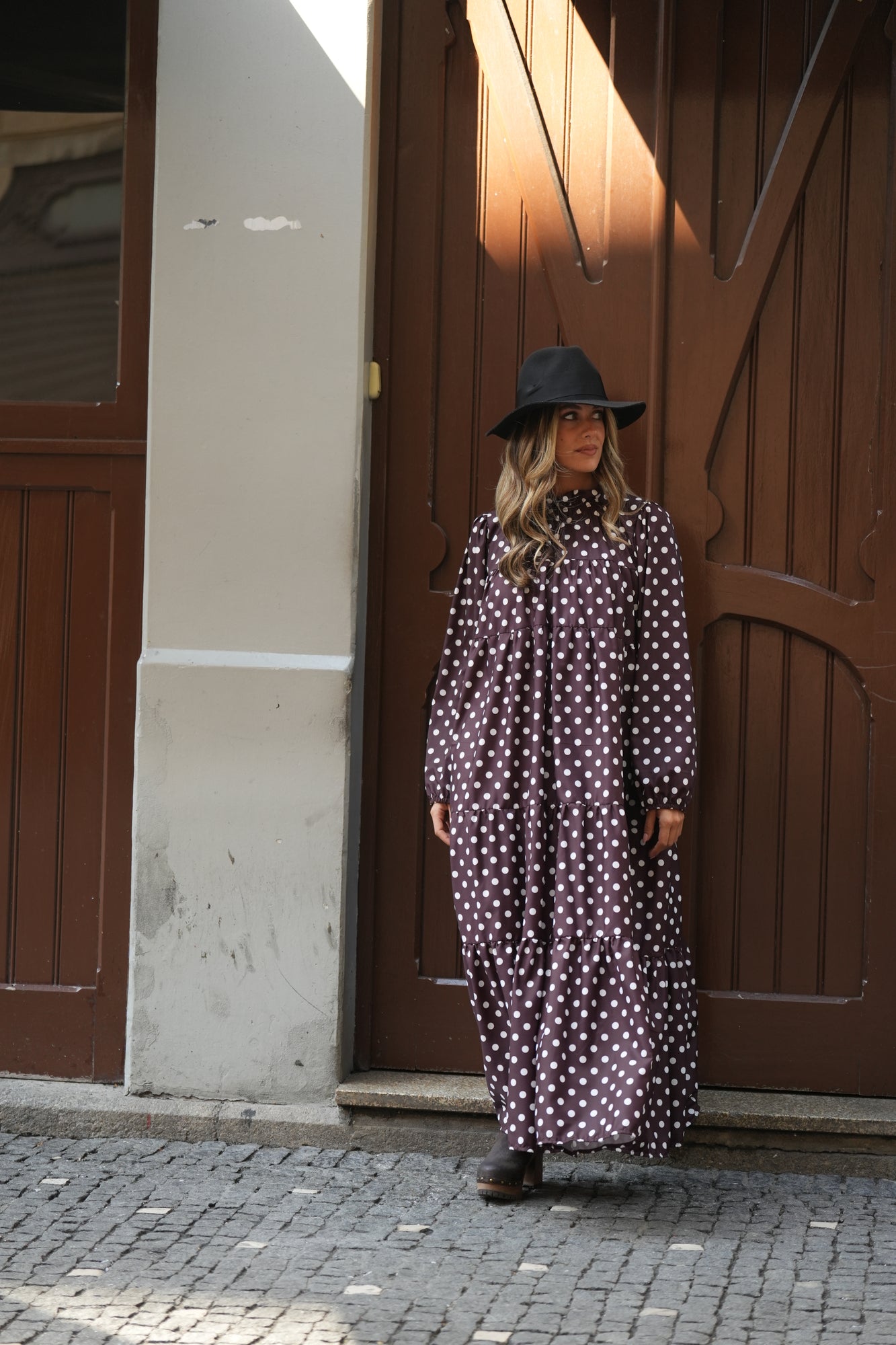- Tecido estampado bolas com fundo castanho